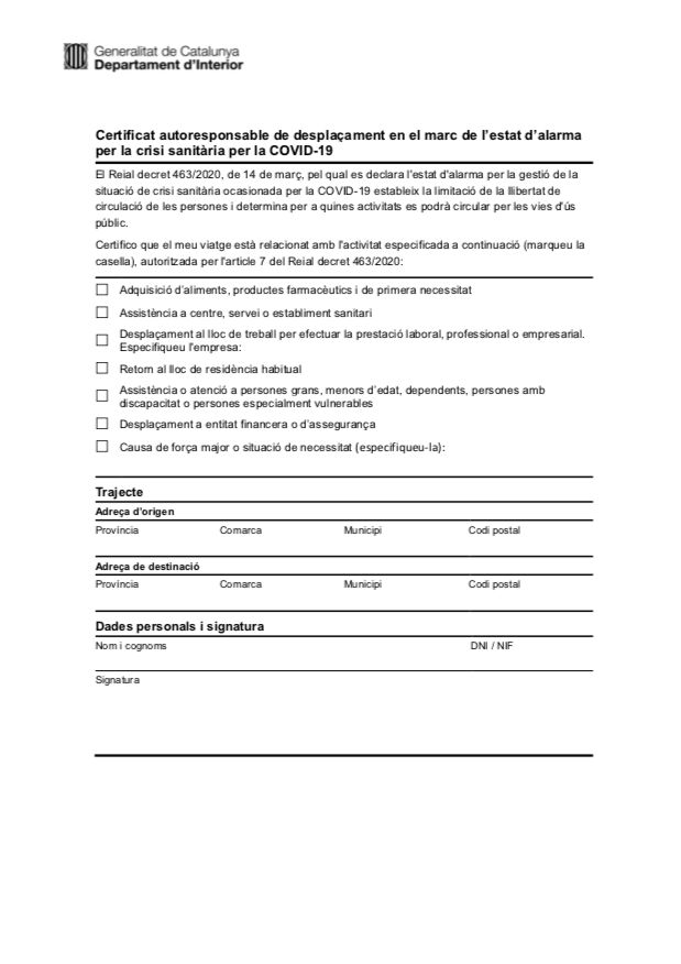 El consejero de Interior, Miquel Buch, ha anunciado esta tarde que «desde el Gobierno de la Generalitat hemos preparado un certificado autorresponsable de desplazamiento que estará disponible esta noche para que la ciudadanía se pueda descargar y que será efectivo a partir de la madrugada del domingo al lunes «. (fuente)
