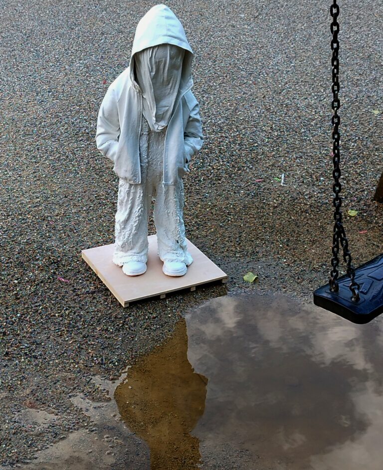 Esta exposición presenta una serie de esculturas de niños de tamaño real que recorren un paisaje de exilio. Las figuras representan a menores obligados a atravesar largos caminos marcados por la guerra y la violencia. A medida que avanzan, otros cuerpos quedan atrás: amigos, hermanos, fragmentos de su infancia. En escena conviven la vida y la muerte. La instalación revela la terrible huella que deja esta experiencia en sus mentes: el miedo constante a ser los próximos, la incertidumbre total y una pérdida tan profunda que destruye la infancia y fractura el tejido de la sociedad futura.